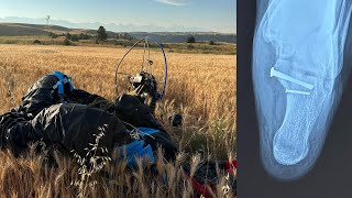 Paramotor pilot lost control during low-altitude flight when wing lines twisted to the left. Made six spins before ground collision. Pilot was using a new high-performance wing in turbulent conditions.
