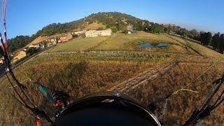 During a demonstration flight in Malaysia, a paramotor pilot flying too low collided with a power line and crashed into a rice field. Water and mud cushioned the impact, resulting in only minor injuries.